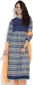 This cotton kurta is so distinctive and classy that you'll want to wear it everyday.With a bold abstract pattern all over, a dark yoke with tonal printed paisleys and bright trims with Khari work,bright panels on the sleeve hems and hemline and a dori tie up at the neck, this kurta is a must buy.Light up the summer season by teaming this with a bright churidar and dangling earrings.Did you know: There is an abandoned village in Georgia called Kurta.