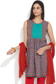 This bright and feminine kurti is all set to cement your ethnic style this summer!The solid kurta comes with brasso effect to add a touch of high-street fashion to your collection.The contrast floral embroidery at the easy-to-wear round neckcomplements the contrast panel detail at the neck and arm holes. The contrast piping in front adds the finishing touches to your casual look.Wear this with contrast leggings and mojaris and silver jhumkas. Did you know: The first fashion magazine was published in Germany in 1586.Sleeveless :: Round neck :: Contrast yoke:: Side slits :: 100% Cotton :: Hand wash separately in cold water :: Do not soak, bleach, wring:: Hang dry in shade :: Warm iron