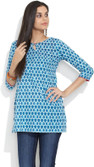 Go all Asian this summer!Embrace this chic kurti which comes with a touch of the Orient,thanks to its mandarin collar and V-neck that extends to the placketthat you can easily button up to secure this look. The outfit's smart 3/4th sleeves end with tabs to cement your casual style. The two insert pockets in front ensure you can keep your essentials handy.Finishing off with side slits that allow easy movement,you're bound to love the lovely modish prints of the kurti. Wear this with contrast leggings and mojaris and silver jhumkas. Did you know: The first fashion magazine was published in Germany in 1586. 3/4th sleeves with tabs :: V-neck with band collar :: Mock placket :: Side slits :: Two insert pockets in front :: 100% Cotton :: Hand wash separately in cold water :: Do not soak, bleach, wring:: Hang dry in shade :: Warm iron
