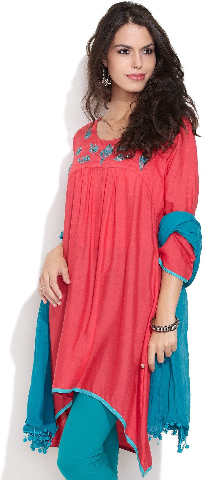 Desi style!Add an extra ooze of chic desi style to your wardrobe with this floral embroidered kurta. From a round split neckline to threefourth sleeves, this unique piece boats a casual yet stylish look.Cut from cotton it ensures a comfortable all-day feel.Wear yours with a pair of snug churidar leggings and open toe sandals.Did you know?The word kurta is a borrowing from Hindustani, and originally from Persian literally meaning a collarless shirt.Three fourth sleeves::Round split neck::Side slits::100% Cotton::Hand wash separately at 30 degrees::Do not bleach::Use mild detergent::Low iron::Line dry in shade::Do not iron on decoration or print
